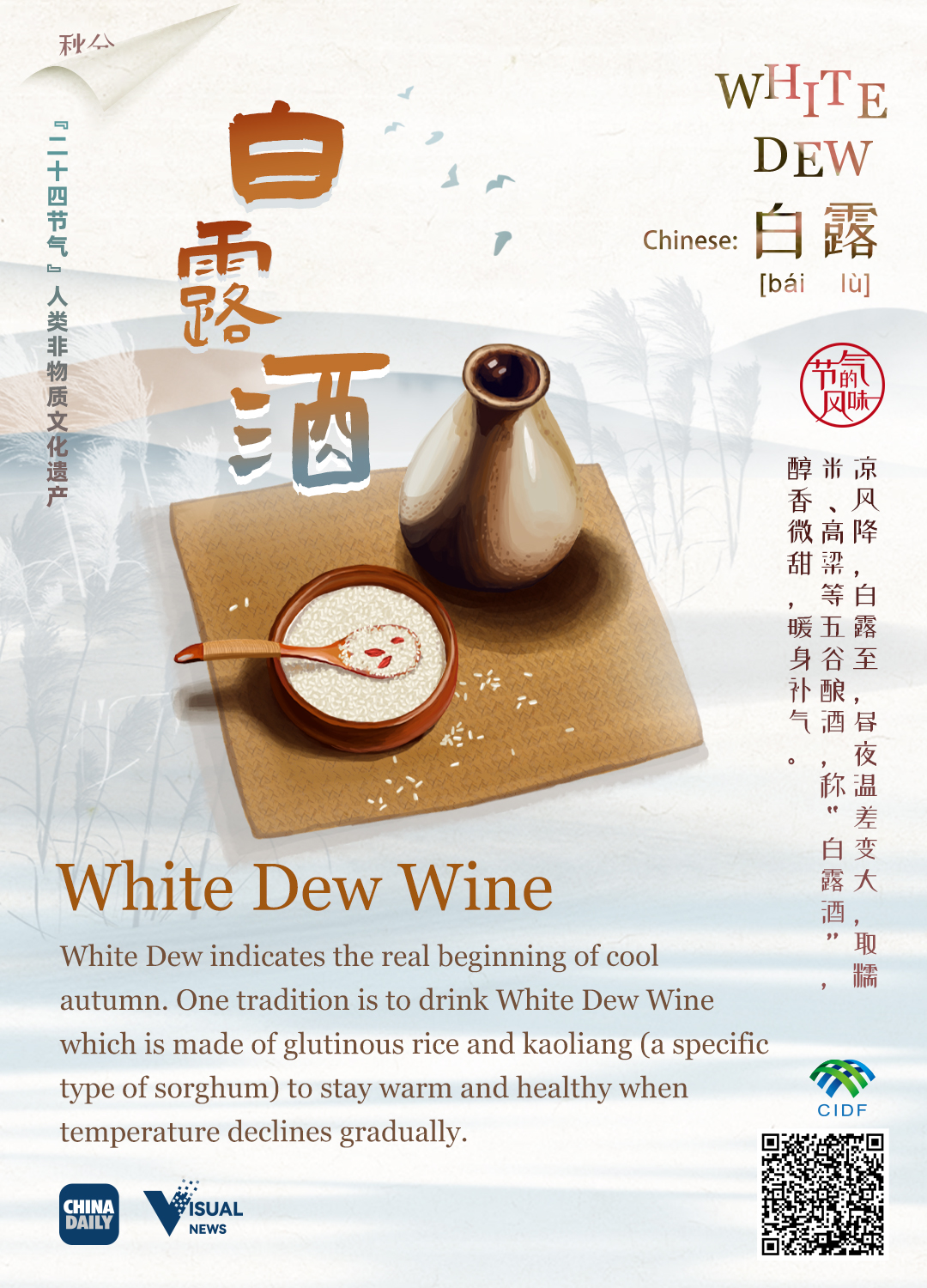 The traditional Chinese solar calendar divides the year into 24 solar terms. White Dew, (Chinese: 白露), the 15th solar term of the year, begins this year on Sept 8 and ends on Sept 22. White Dew indicates the real beginning of cool autumn. The temperature declines gradually and vapors in the air often condense into white dew on the grass and trees at night.