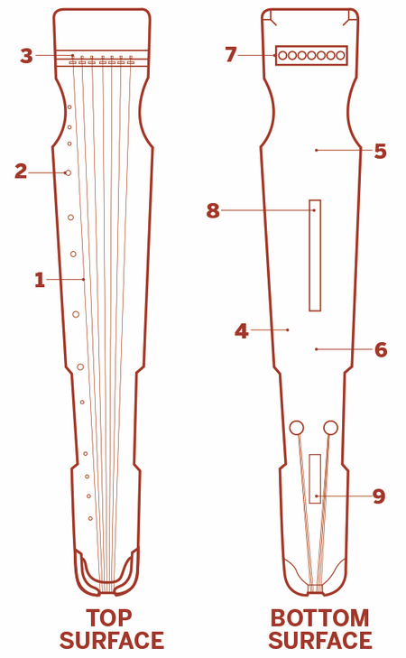 The body of the guqin is a long, narrow, hollow box made from wood. The top is carved into an arch, while the bottom is flat. The bridge of the guqin is made from hard wood, and the strings are attached to it. The narrow end of the strings are bent over the tail and are tied to the bottom.