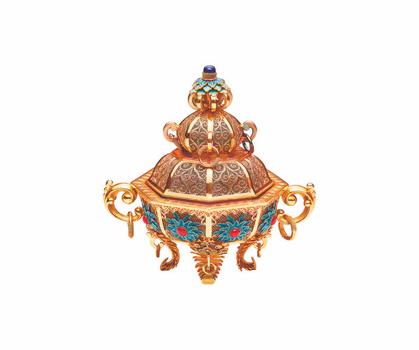 Highlights of the show The Marvels of Craftsmanship include an exquisite vessel of filigree inlaid metal art. [Photo provided to China Daily]