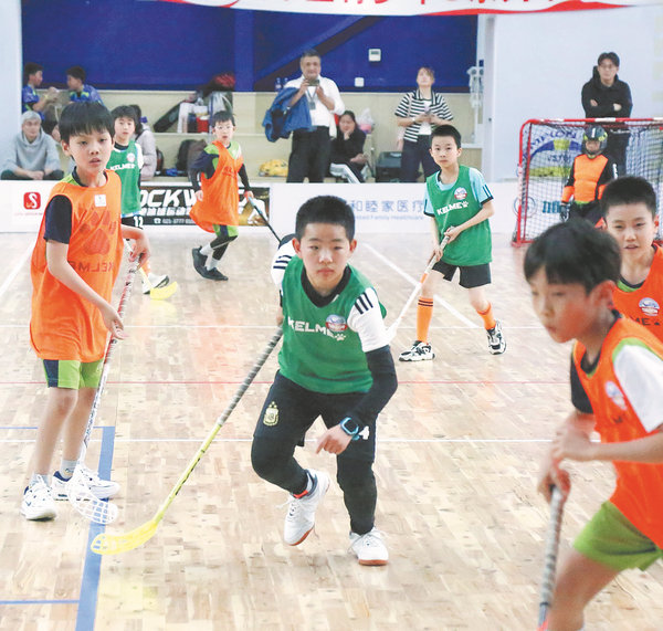 Middle school students compete in a floorball match at Shanghai Opark on April 21. [Photo provided to China Daily]