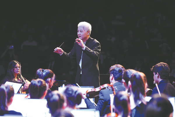 Conductors Liu Zheng and Christian Vasquez work with young musicians of the Juan Jose Landaeta Symphony Orchestra from Venezuela and the Soong Ching Ling Peace Angel Art Troupe Orchestra of Beijing during the concert. CHINA DAILY